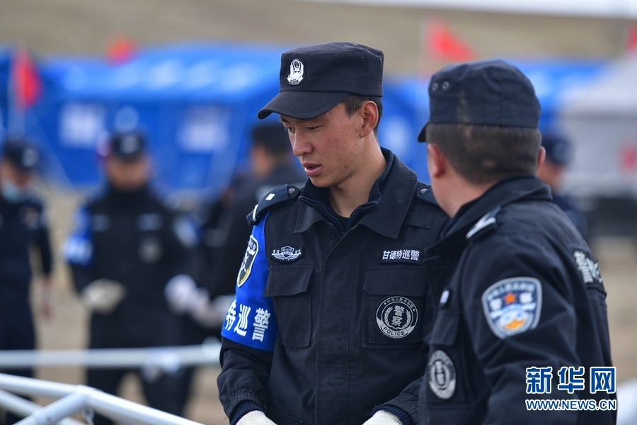5月26日,果洛州公安局特警支隊的特警在瑪多縣縣政府廣場臨時安置點內(nèi)巡邏。