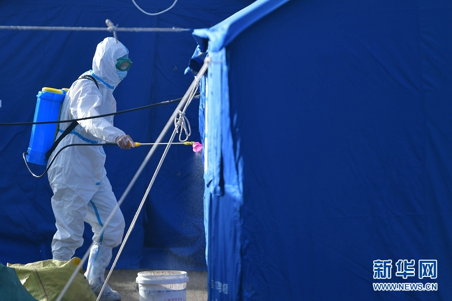 5月26日,一名工作人員在瑪多縣黃河鄉(xiāng)安置點內(nèi)進(jìn)行消殺作業(yè)。