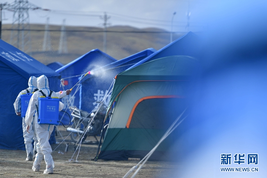 5月26日,兩名工作人員在瑪多縣黃河鄉(xiāng)安置點內(nèi)進(jìn)行消殺作業(yè)。