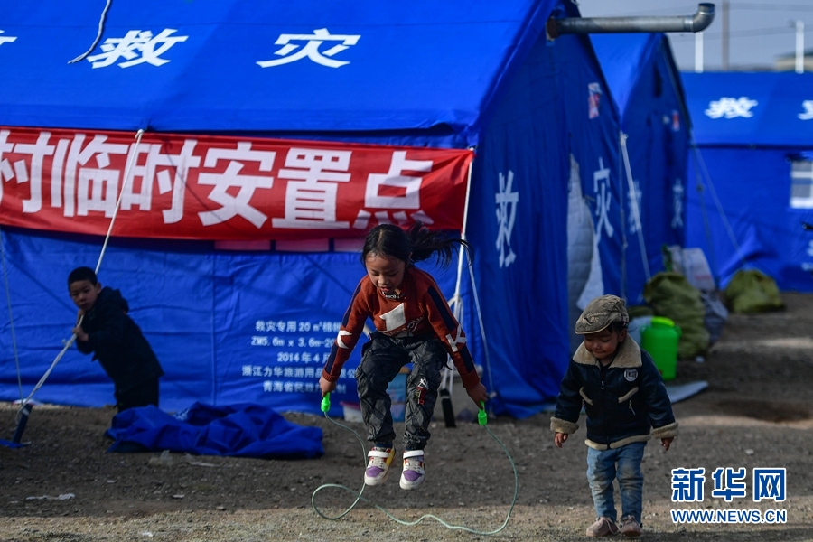 5月26日,三名小朋友在瑪多縣瑪查理鎮(zhèn)安置點內(nèi)玩耍。