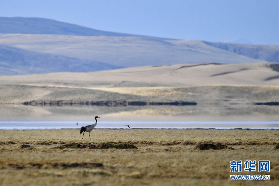 5月26日,一只黑頸鶴漫步在瑪多縣境內(nèi)的一處濕地上。