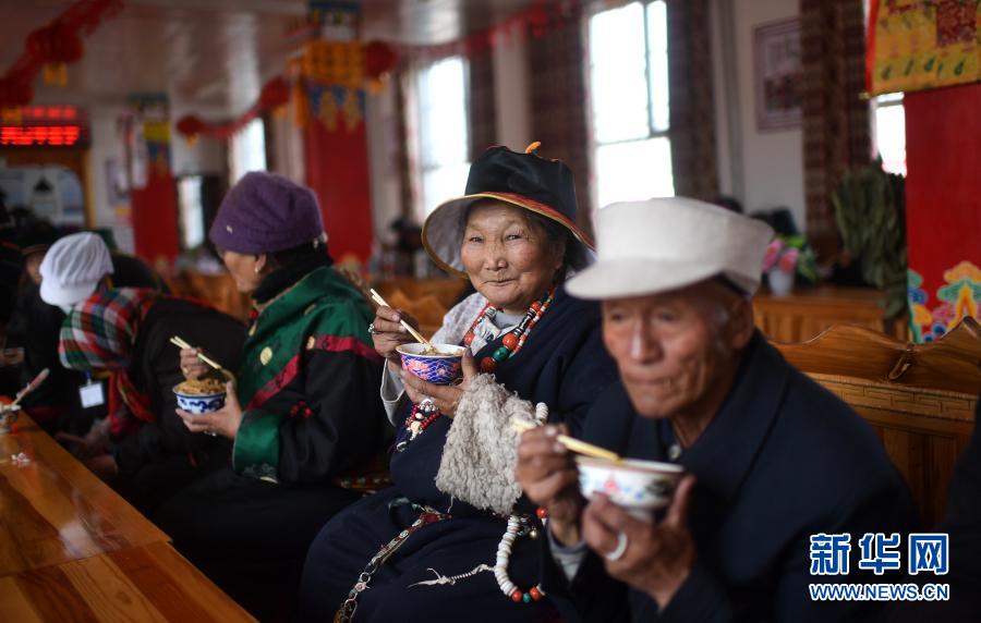 圖為治多縣幸福敬老院內(nèi),老人們?cè)诓蛷d吃早餐。胡貴龍 攝