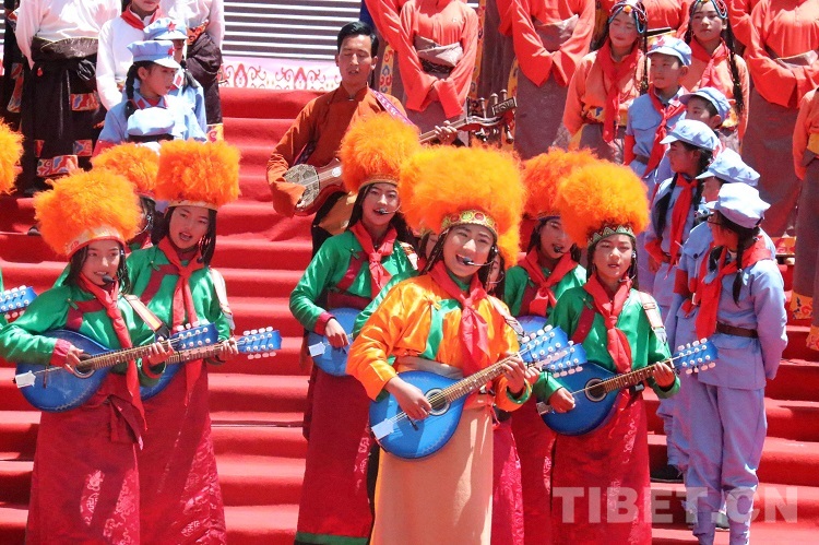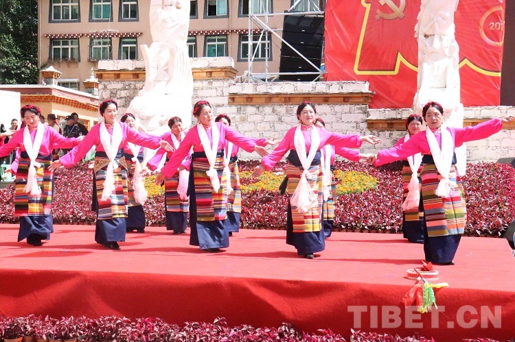 活動(dòng)現(xiàn)場(chǎng),黨旗國旗飄揚(yáng)、哈達(dá)傳情,在一片歡騰的海洋里,大家載歌載舞齊唱光輝歲月,放聲歌頌幸福美好生活,盡情抒發(fā)高城兒女的愛黨愛國情懷。歌曲《翻身農(nóng)奴把歌唱》《草原上升起不落的太陽》,穿插吉祥老人頌詞和舞蹈。表達(dá)高原兒女在中國共產(chǎn)黨的領(lǐng)導(dǎo)下,翻身獲得解放,掌握了自己的命運(yùn)。短短幾十年的發(fā)展過程,涉藏州縣迎來騰飛,經(jīng)濟(jì)社會(huì)發(fā)生了翻天覆地的變化,與祖國同步實(shí)現(xiàn)全面小康。