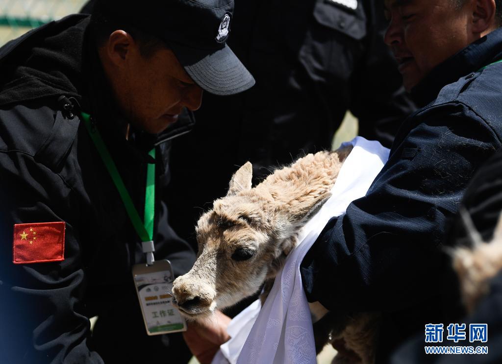 7月7日,在可可西里索南達(dá)杰保護(hù)站野生動物救助中心,可可西里巡山隊員按照風(fēng)俗為放歸的藏羚羊戴上哈達(dá)表達(dá)祝福。新華社記者 張龍 攝