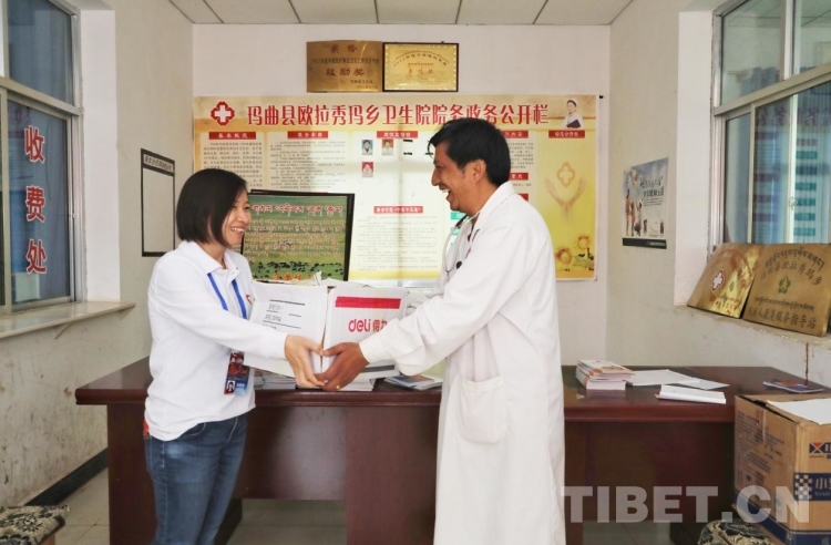 圖為2018年志愿者劉雅梅在瑪曲縣歐拉秀瑪鄉(xiāng)全程參與藥品發(fā)放和后勤工作
