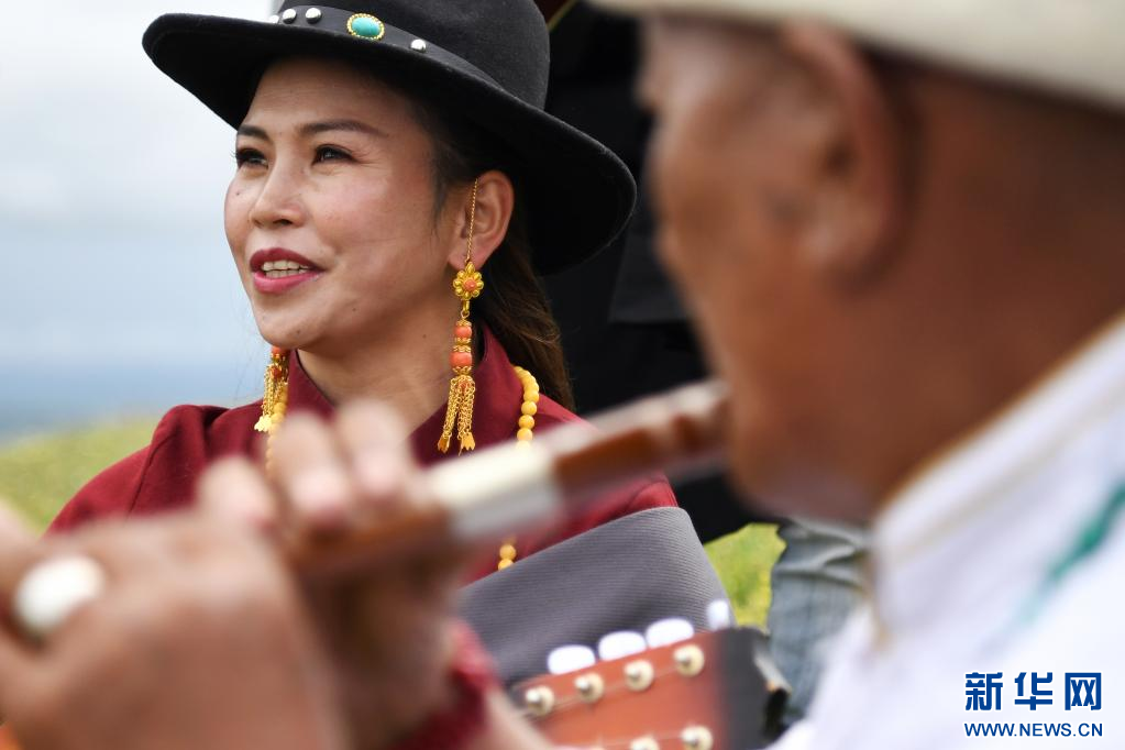 格薩爾彈唱藝人旦知吉(左)在瑪曲草原上彈唱格薩爾(7月14日攝)。新華社記者 杜哲宇 攝
