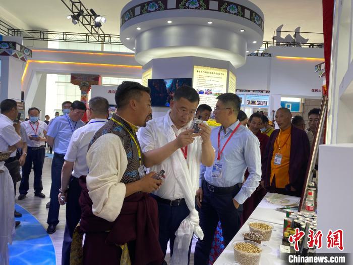 圖為在第22屆青洽會(huì)上,拉東才索南帶來(lái)了黑青稞酒、面等產(chǎn)品。受訪者供圖