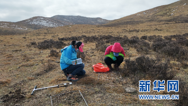 郭娜(右)和同學(xué)在進(jìn)行春季牧場(chǎng)的植被調(diào)查。(受訪者供圖)