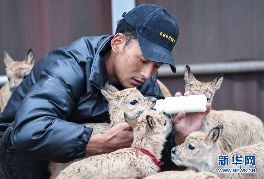 可可西里國家級自然保護(hù)區(qū)卓乃湖保護(hù)站的工作人員才文多杰在給藏羚羊幼仔喂奶(2020年7月7日攝)。新華社記者 薛玉斌 攝