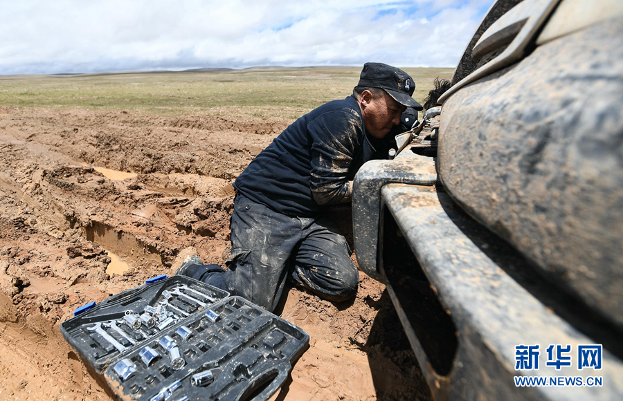 可可西里國家級自然保護(hù)區(qū)卓乃湖保護(hù)站站長秋培扎西在可可西里地區(qū)修理車輛(2020年7月6日攝)。新華社記者 薛玉斌 攝