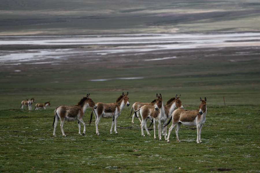 在三江源地區(qū),一群藏野驢在草原上活動(7月25日攝)。新華社記者 張龍 攝