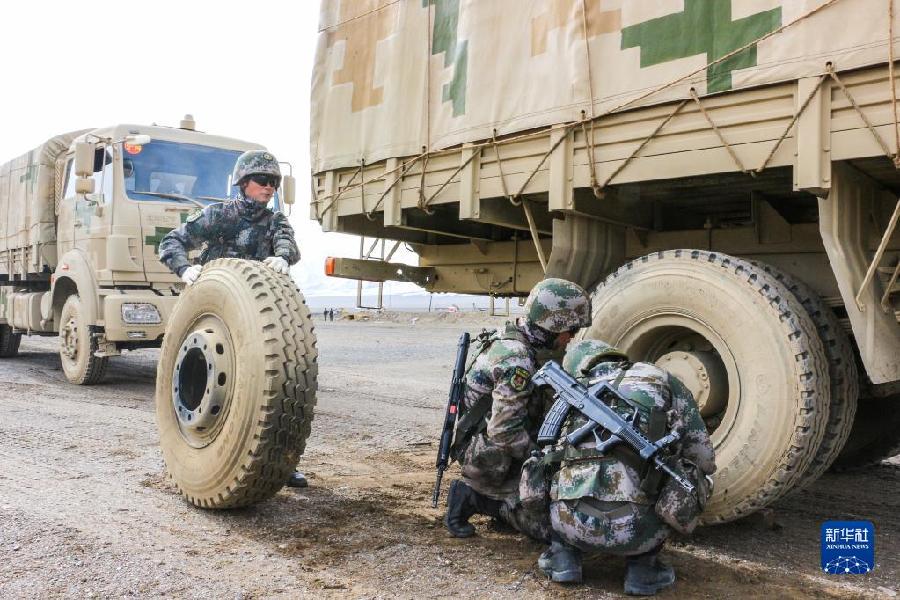 聯(lián)勤保障部隊(duì)汽車運(yùn)輸某團(tuán)一營(yíng)一連參加高原駐訓(xùn)時(shí),在行車途中組織官兵進(jìn)行防衛(wèi)演練(2020年6月16日攝)。新華社發(fā)