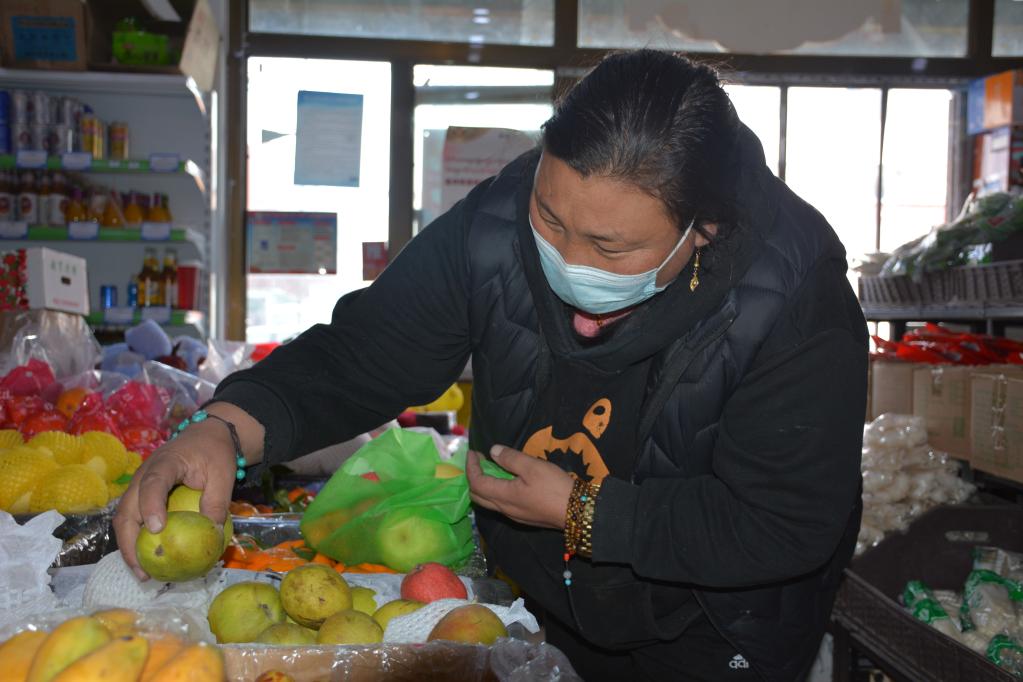 在青海省果洛藏族自治州瑪多縣的菜鋪內,當?shù)鼐用袂|正在挑選水果。柳澤興 攝