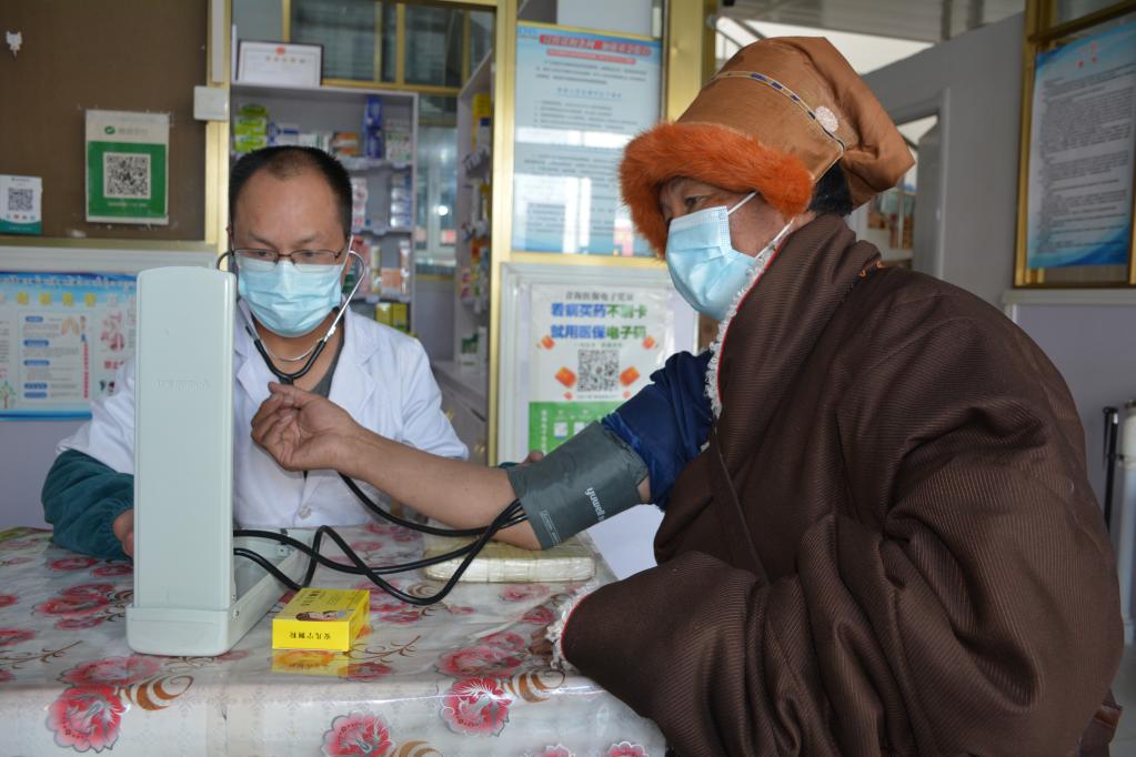 在一旁的復康診所內,日洛正在給生病的孫子買藥。“小孩子發(fā)熱咳嗽,拿點感冒藥就行,記得一天吃三次?!钡却蠓蛘f罷,日洛又挽起衣袖請大夫給自己量血壓?!霸\所開在家門口,頭疼腦熱買藥方便?,F(xiàn)在生活好了,我也要注意身體,還等著小孫子帶我出去旅游呢?!比章逭f。