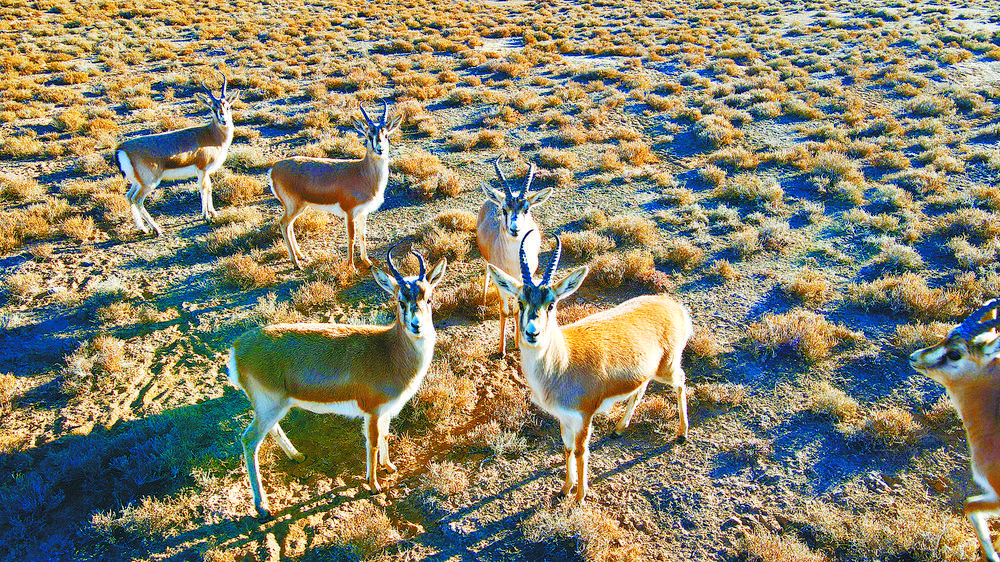 近日,海西蒙古族藏族自治州當(dāng)?shù)財z影愛好者在祁連山國家公園德令哈片區(qū)拍攝到結(jié)伴覓食的珍稀野生動物——鵝喉羚。鵝喉羚屬典型的荒漠、半荒漠區(qū)域生存的動物,體型似黃羊,因雄性在發(fā)情期喉部肥大,狀如鵝喉,故得名“鵝喉羚”。