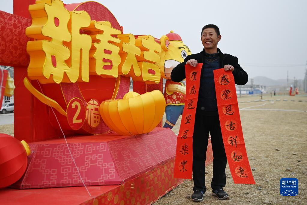 1月25日,在蘭州新區(qū)舟曲避險(xiǎn)搬遷安置點(diǎn),搬遷群眾展示領(lǐng)取的春聯(lián)。新華社記者 范培珅 攝