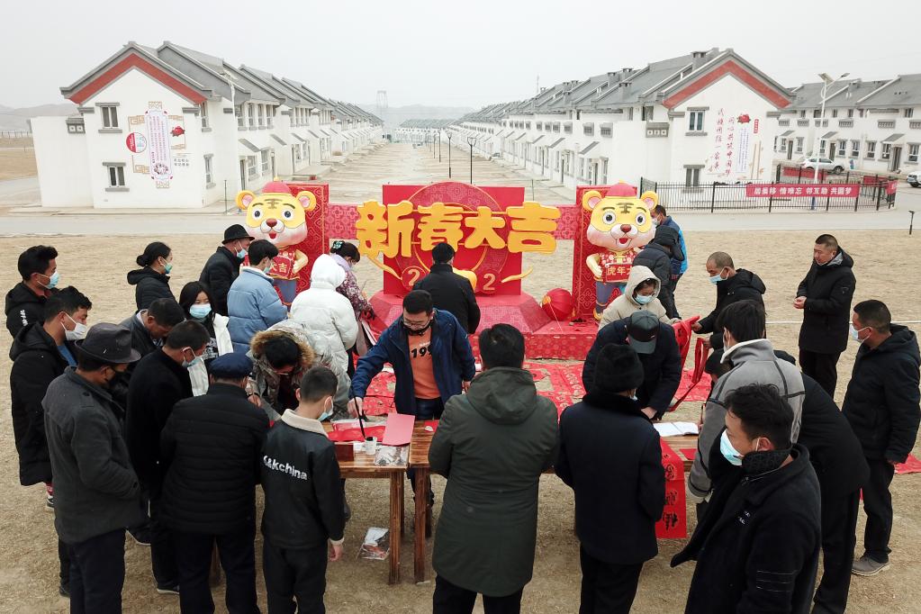 1月25日,在蘭州新區(qū)舟曲避險搬遷安置點,舟曲地質(zhì)災(zāi)害避險搬遷第一臨時黨支部組織書法家給搬遷群眾送春聯(lián)。新華社記者 范培珅 攝