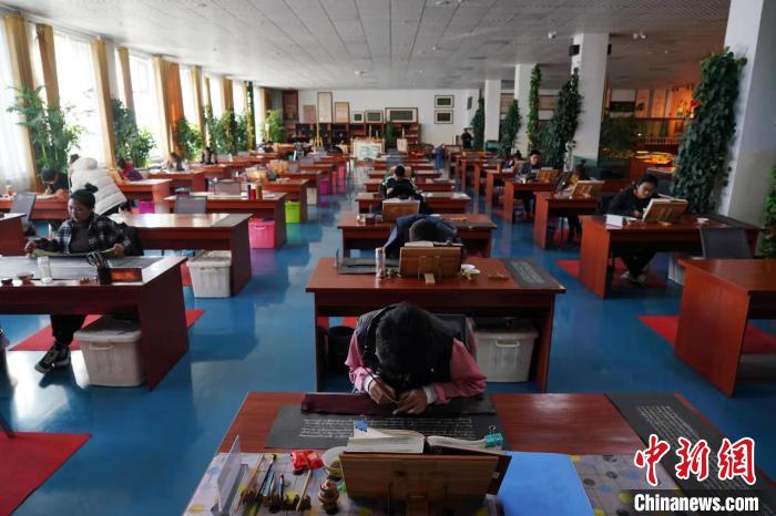 走進非物質文化遺產綜合傳習中心(熱貢文化)內,幾十名學員端坐在桌前,持竹筆蘸著金汁或銀汁在特質的藏紙上抄寫經文,另一側,幾名學員盤腿而坐,在寫好的金書上開始繪制唐卡。