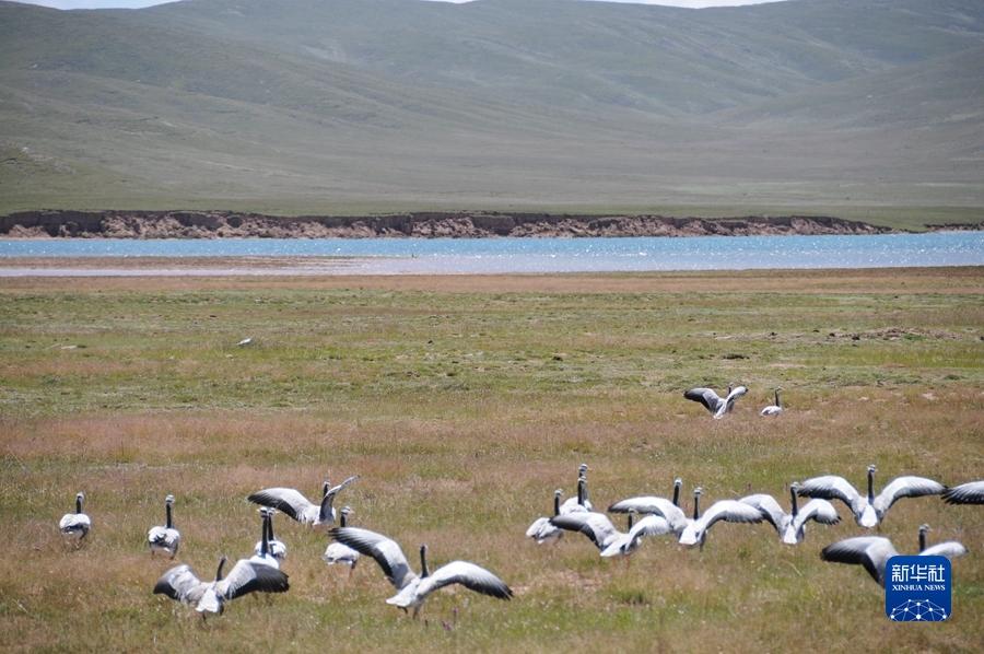 2020年8月19日,在三江源國家公園黃河源園區(qū)內(nèi),一群斑頭雁在黃河邊草地上翩然起飛。新華社記者 呂雪莉 攝