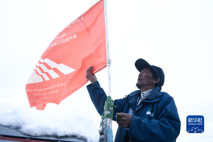 2021年10月20日,在青海省果洛藏族自治州瑪多縣扎陵湖鄉(xiāng)勒那村,三江源國家公園黃河源園區(qū)生態(tài)管護(hù)員安才在整理管護(hù)隊旗幟。新華社記者 張龍 攝