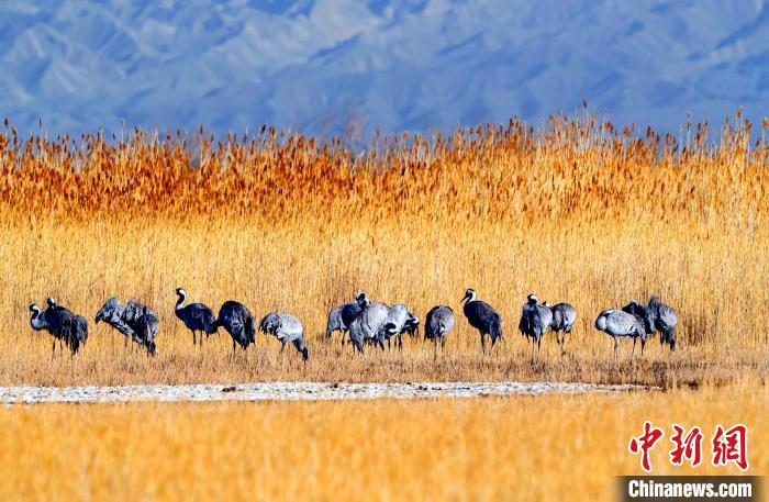 在位于青海省果洛藏族自治州瑪多縣境內(nèi)的三江源國家公園黃河源園區(qū),一群蓑羽鶴在黃河河道間棲息覓食。新華社記者 呂雪莉 攝