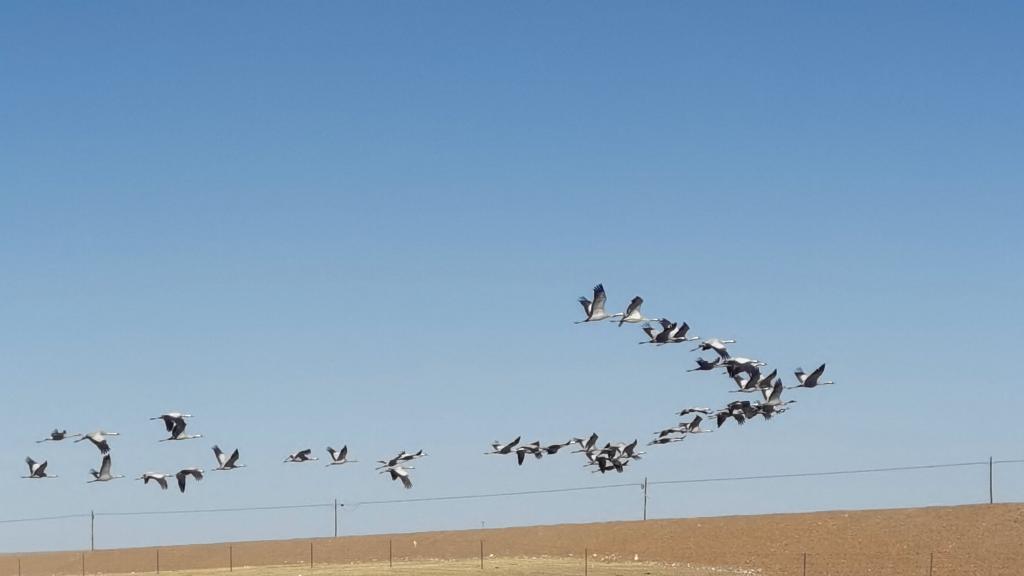 蓑羽鶴生性機(jī)警,記者所乘車輛在約百米遠(yuǎn)處剛停下,成群的蓑羽鶴便展翅高飛,發(fā)出陣陣鳴叫,急急地向東北方向飛去。