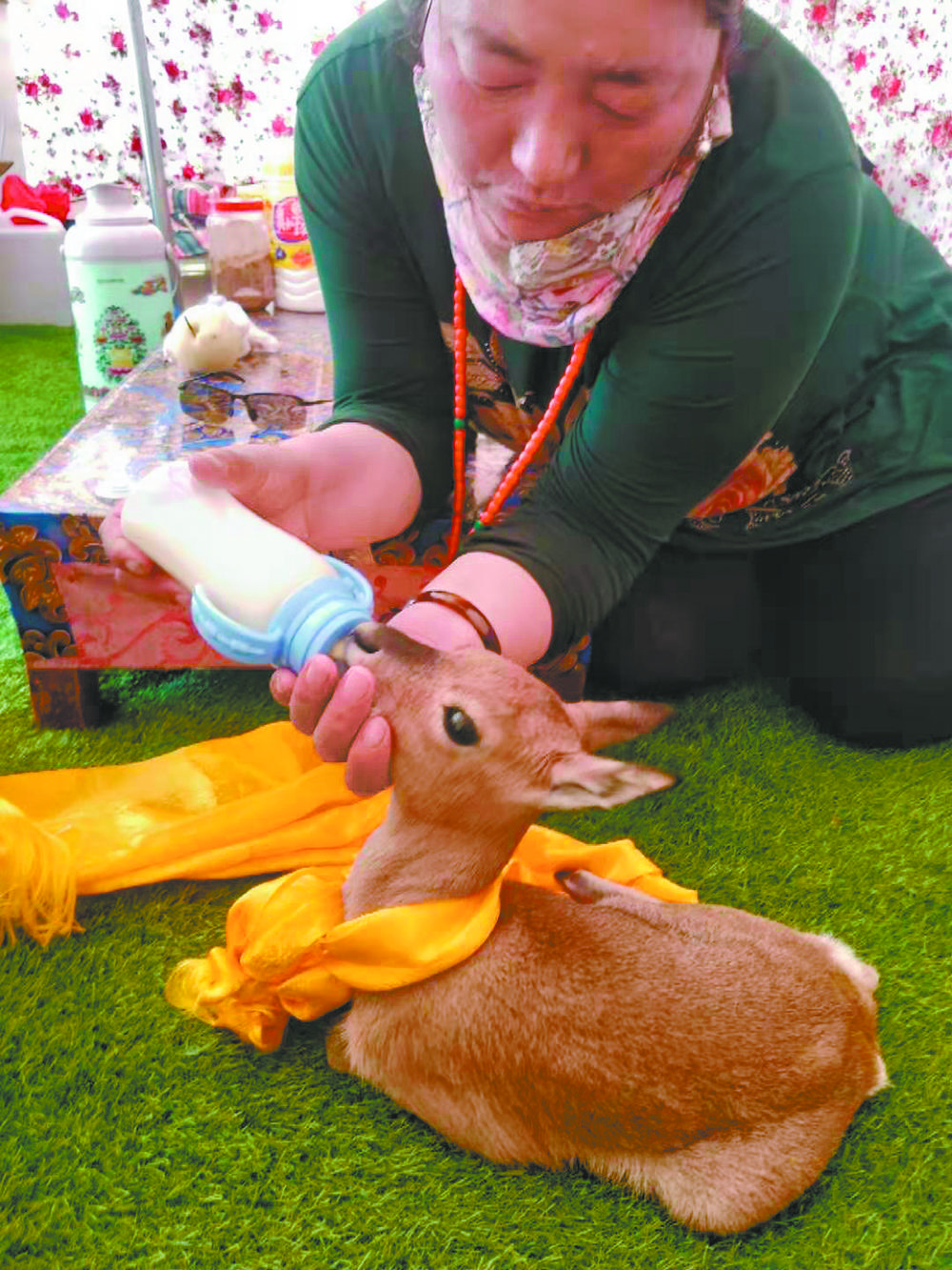 妻子扎西卓瑪始終沒有放棄喂養(yǎng)它,最初的3天,她每天都要花6個多小時,或跪著或趴著,把奶嘴一次次伸進“豆豆”口中,但又一次次被吐了出來。一家人整夜操心,輪流給它喂水喂奶,扎西卓瑪還在它的脖子上系了一條黃色的哈達,當做“幸運結(jié)”,希望小原羚能活下來。