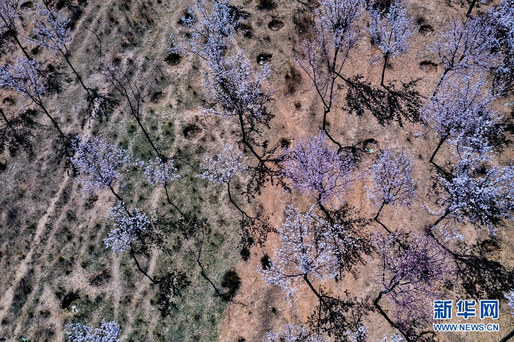 盛開的梨花與斑駁的樹影,形成一道別致的風(fēng)景線。新華網(wǎng) 宋忠勇 攝