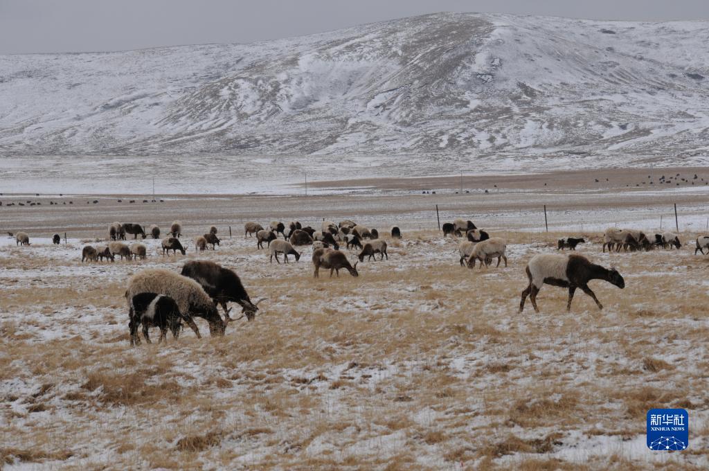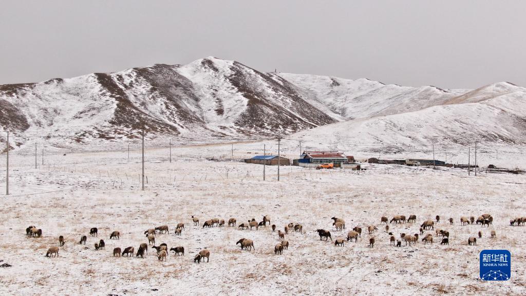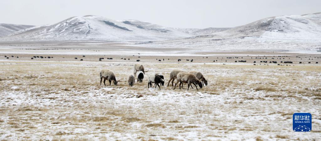 3月31日,青海省黃南藏族自治州河南蒙古族自治縣,一群歐拉羊在雪后的草原上吃草?!⌒氯A社記者 王艷 攝