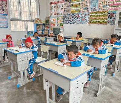 2017年,隨著易地扶貧搬遷政策的落實(shí),越來(lái)越多村民選擇搬到山腳開(kāi)始新的生活。學(xué)校里的孩子們由32名減少到9名?!?個(gè)孩子有7個(gè)是留守兒童,最大的8歲,最小的3歲。”完么仁增把黑板分成兩塊,左邊是一年級(jí),右邊是學(xué)前班,“安排了語(yǔ)文、數(shù)學(xué)、美術(shù)、道德與法治4門課,采用復(fù)式班的教學(xué)模式”。
