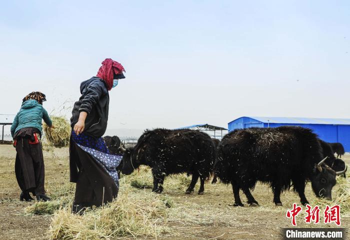 圖為東科日生態(tài)畜牧業(yè)合作社里工作人員向牦牛投喂飼草。張海麟 攝