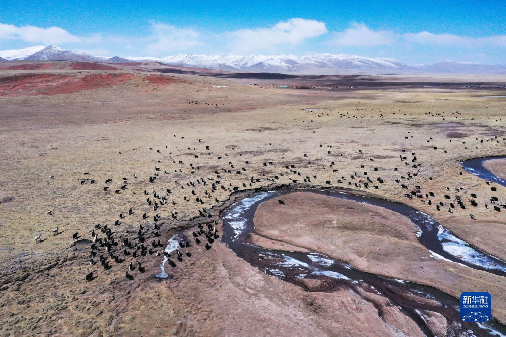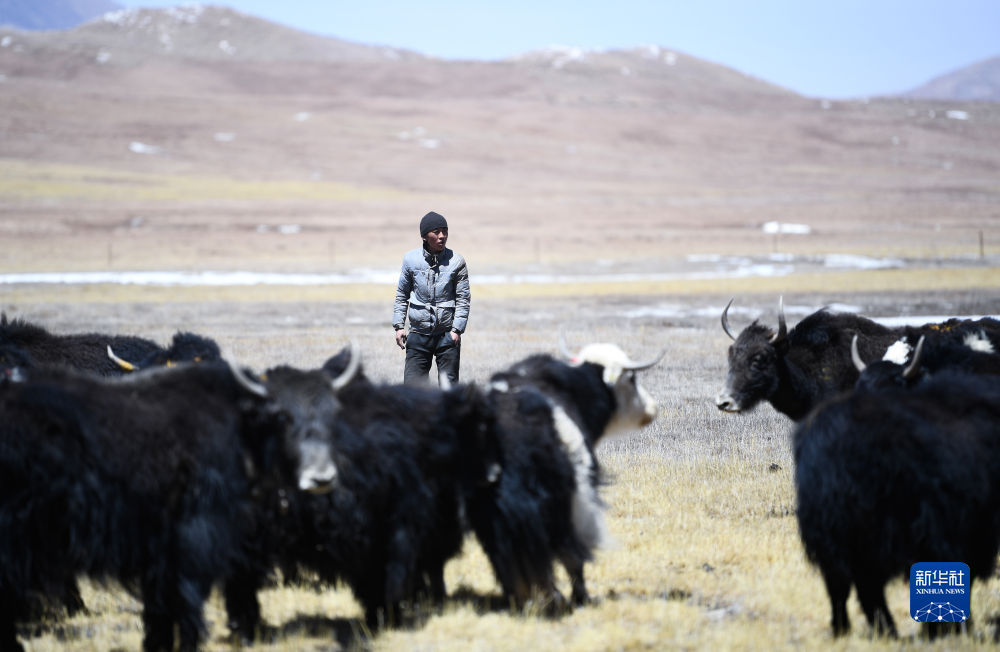 4月20日,在青海省玉樹(shù)藏族自治州曲麻萊縣,牧民在放牧。新華社記者 張龍 攝