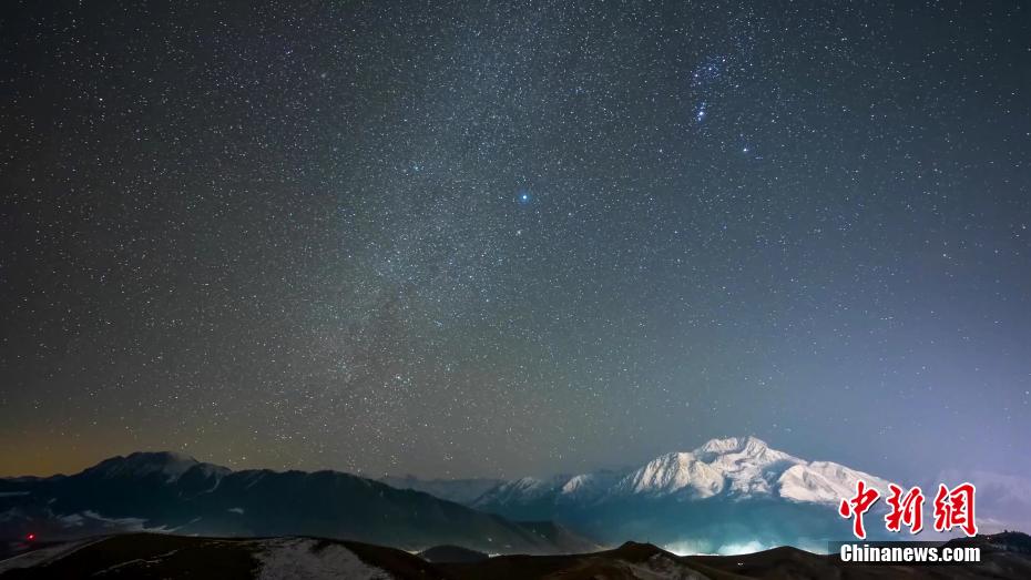 近日,攝影愛(ài)好者在位于祁連山腹地的青海省海北藏族自治州祁連縣,用延時(shí)攝像的方式記錄下鮮有人知的春日祁連山壯麗星河和絕美晨曦。祁連山海拔在4000米至6000米之間,海拔4000米以上的地方,稱為雪線,一般而言,冰天雪地,萬(wàn)物絕跡。雪線之上,夜晚布滿繁星的銀河是祁連山最美奇觀之一。清晨,銀白的曙光漸顯緋紅,朝霞映在當(dāng)?shù)孛癖娦闹小吧裆健迸P纳缴?,“神山”宛如少年俊朗?jiān)毅。馬志原 攝