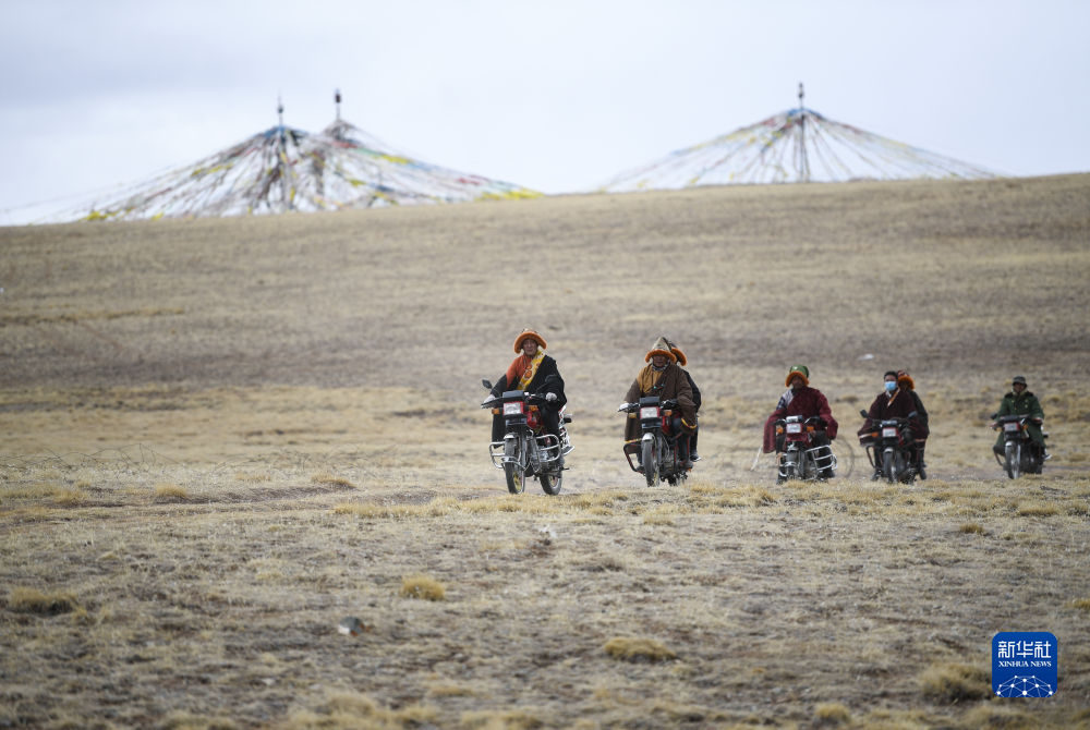 4月21日,在青海省玉樹藏族自治州曲麻萊縣麻多鄉(xiāng)約古宗列曲附近,生態(tài)管護(hù)員才仁扎西駕駛摩托車巡護(hù)。新華社記者 張龍 攝