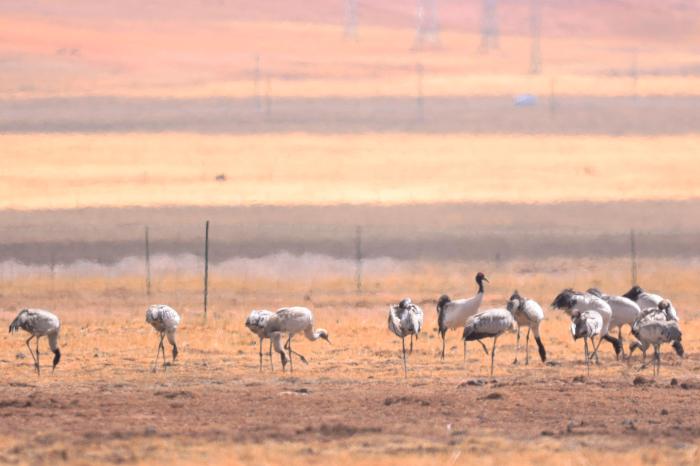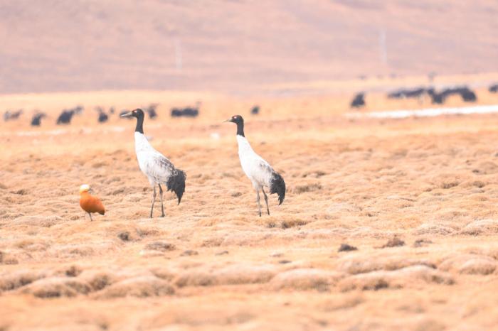 圖為黑頸鶴與灰鶴。青海多美生態(tài)環(huán)保科技有限公司 供圖