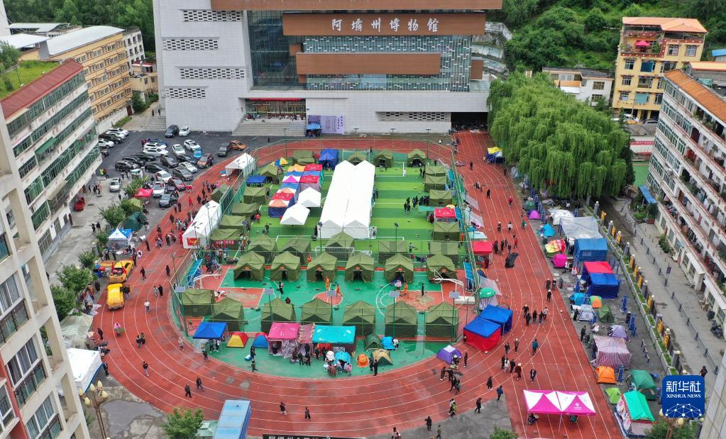 6月10日拍攝的馬爾康市州醫(yī)院背后廣場安置點(diǎn)(無人機(jī)照片)。新華社記者 劉坤 攝