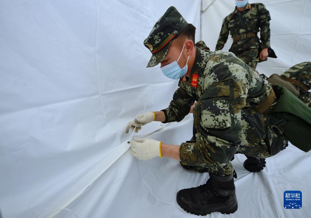 6月10日,在馬爾康市州醫(yī)院背后廣場安置點(diǎn)內(nèi),武警阿壩支隊(duì)隊(duì)員在搭建帳篷。新華社記者 劉坤 攝