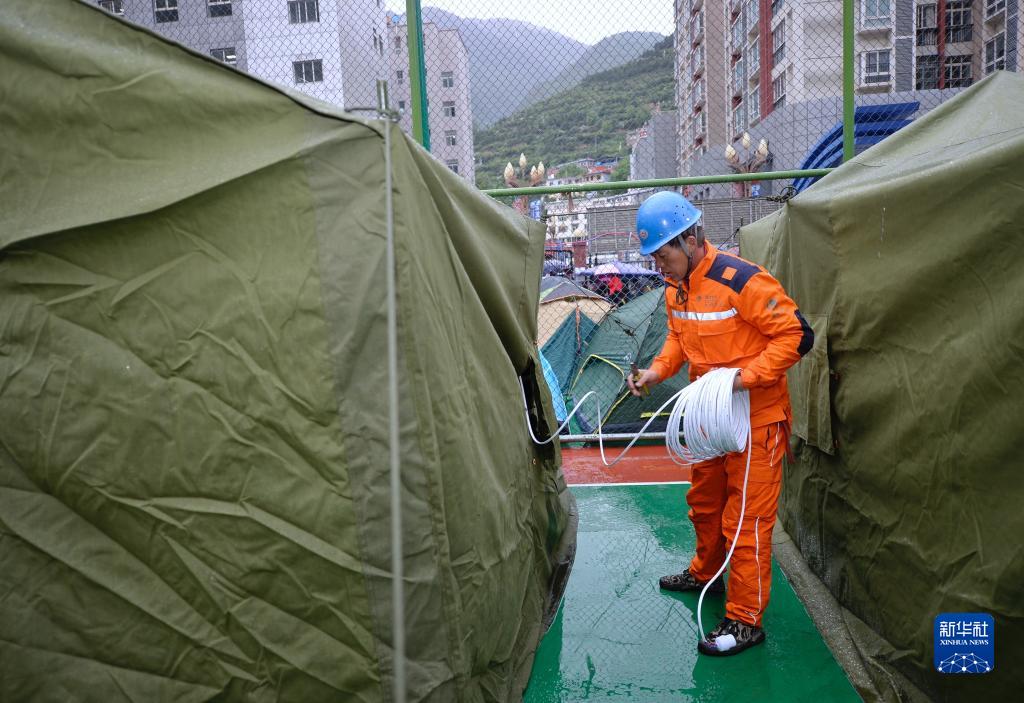 6月10日,在馬爾康市州醫(yī)院背后廣場安置點(diǎn)內(nèi),國家電網(wǎng)工作人員在鋪設(shè)電線。新華社記者 劉坤 攝
