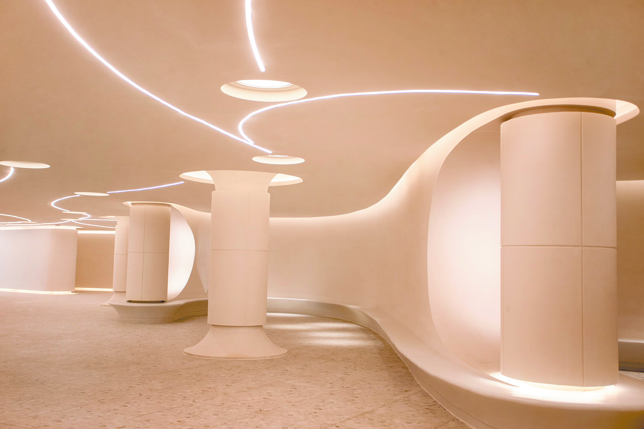 “看見(jiàn)九寨”大樓內(nèi)的10余個(gè)空間里,設(shè)計(jì)團(tuán)隊(duì)用不同的色彩和科技表現(xiàn)手法表達(dá)出不同的舒緩風(fēng)格,治愈人心。“獨(dú)自醒來(lái)”藝術(shù)館運(yùn)用弧形和曲線,將空間切割出曼妙的身形,輕盈靈動(dòng),淺黃柔色的燈光彌漫著溫柔氣息;以白色調(diào)為主的“九寨時(shí)光”圖書(shū)館,能讓人從浮躁中快速安靜下來(lái)。