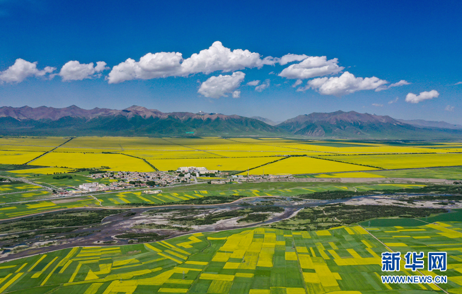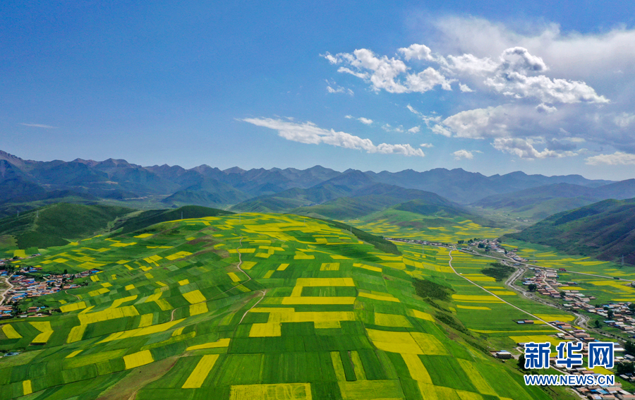 金黃色的油菜花在藍(lán)天白云映襯下,形成了一幅壯麗畫(huà)卷。新華網(wǎng) 宋忠勇 攝