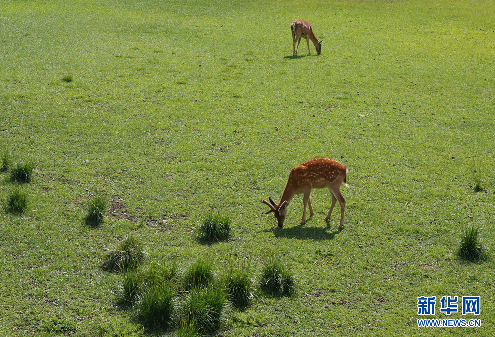 祁連鹿場(chǎng),兩只梅花鹿正在愜意地吃草。新華網(wǎng) 卡婭梅朵 攝