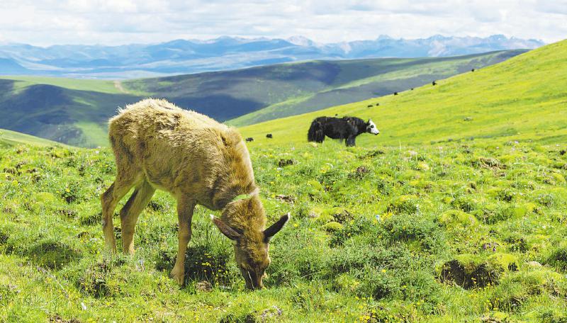 小白唇鹿每天都會(huì)跟著達(dá)瓦拉姆家的牦牛群在高原牧場吃草玩耍。尹鋼 攝