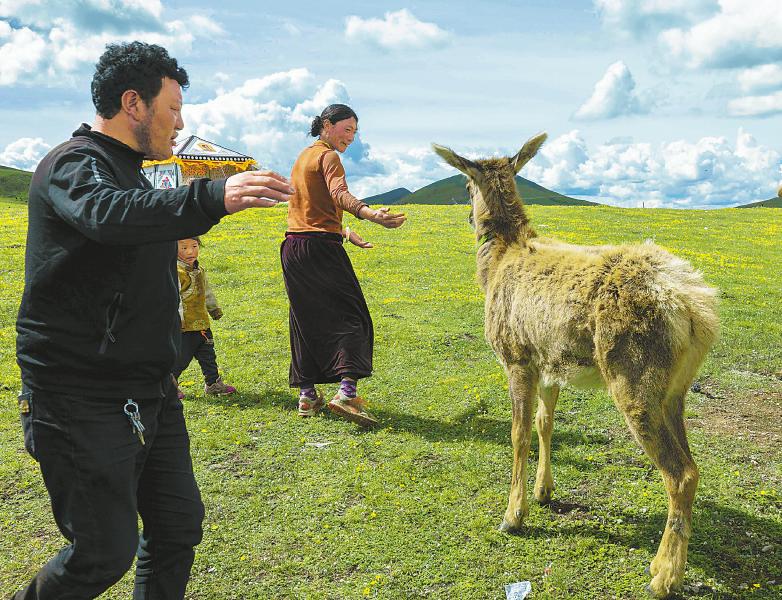 2022年7月14日,在海拔4450米的四川省甘孜州白玉縣安孜鄉(xiāng)門馬一村高原牧場,一只國家二級(jí)保護(hù)動(dòng)物白唇鹿跟隨牧民達(dá)瓦拉姆家的牦牛群,悠閑地在草場上覓食青草。吃飽喝足后的小鹿回到牧民定居點(diǎn)的達(dá)瓦拉姆家門口,還會(huì)主動(dòng)把頭伸到達(dá)瓦拉姆的懷里蹭來蹭去,呦呦地叫著賣萌。