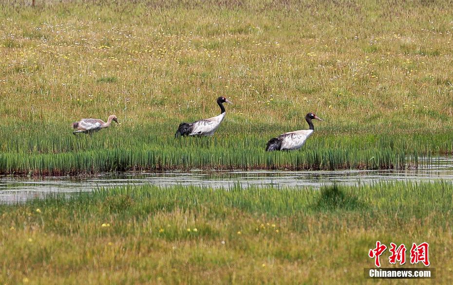 8月9日,祁連山南麓的青海省海北藏族自治州祁連縣央隆鄉(xiāng),三只黑頸鶴正在央隆濕地悠閑踱步,不時發(fā)出鳴叫聲。黑頸鶴是大型飛行涉禽,頸的上部為黑色,故稱黑頸鶴。每年,黑頸鶴在春季遷徙到繁殖地,秋季到達(dá)越冬地,是世界上唯一生長、繁殖在高原的鶴。