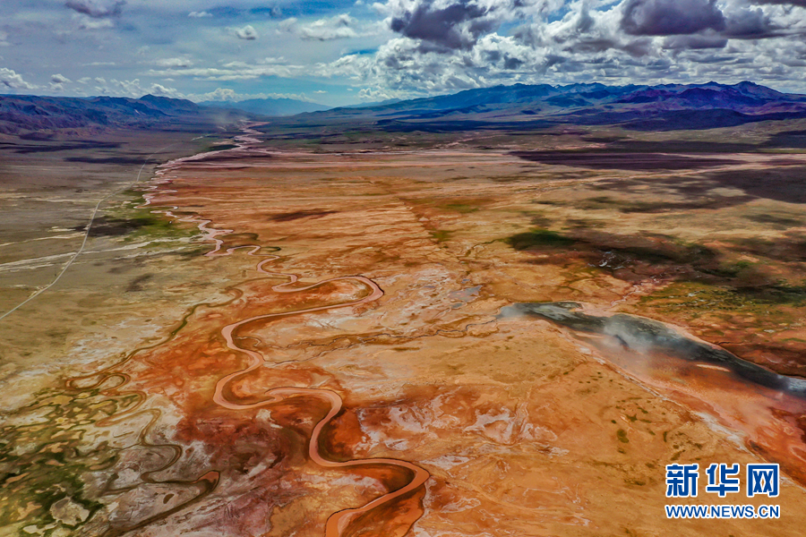 高空俯瞰阿拉克湖國家濕地公園,大地紋理清晰、赤紅嫩綠分明。