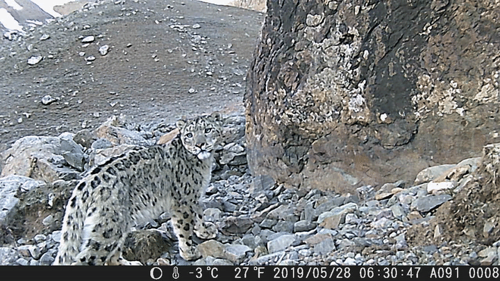 “我時常覺得,與其說是我們觀察雪豹,不如說是雪豹在觀察我們,它觀察我們,比我們觀察它要容易得多?!睋?jù)王大軍講述,有一次,團隊追蹤到一只雪豹的身影停留在山間,但遠(yuǎn)遠(yuǎn)望去,只有一條尾巴露在外面。通過攝影設(shè)備拉近畫面,才發(fā)現(xiàn)原來那只雪豹的雙眼也正在透過巖石的縫隙,觀察著他們。