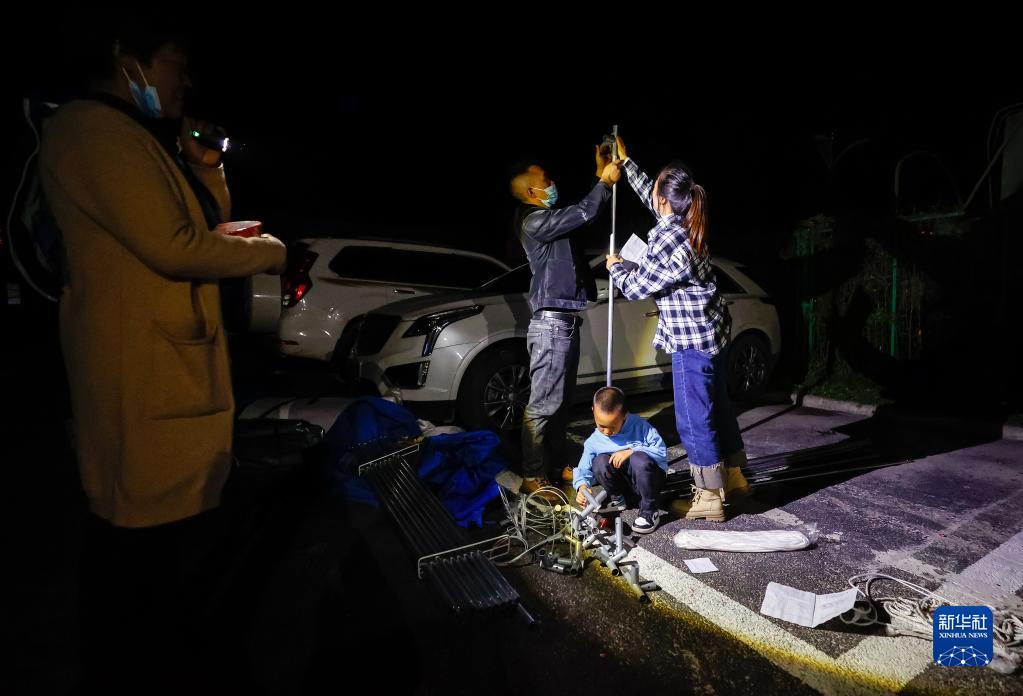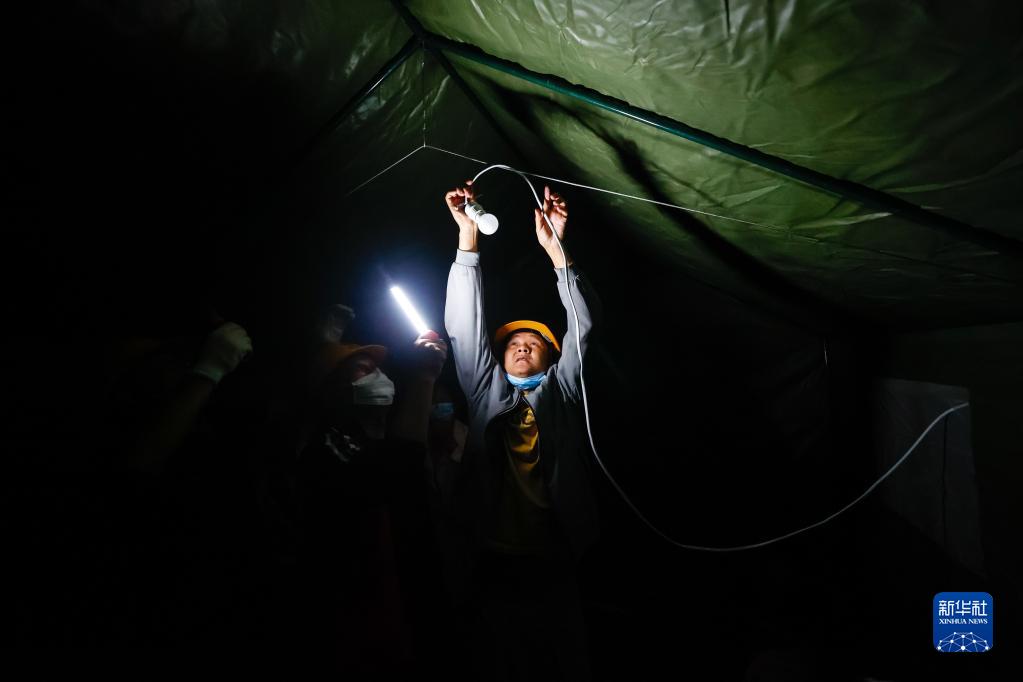 9月5日晚,在四川甘孜州瀘定縣磨西鎮(zhèn)的受災(zāi)群眾臨時(shí)安置點(diǎn),工作人員安裝電燈。新華社 沈伯韓 攝