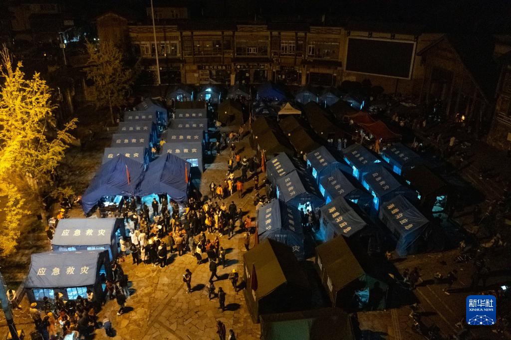 9月5日晚在四川甘孜州瀘定縣磨西鎮(zhèn)拍攝的受災(zāi)群眾臨時(shí)安置點(diǎn)(無人機(jī)照片)。新華社 沈伯韓 攝