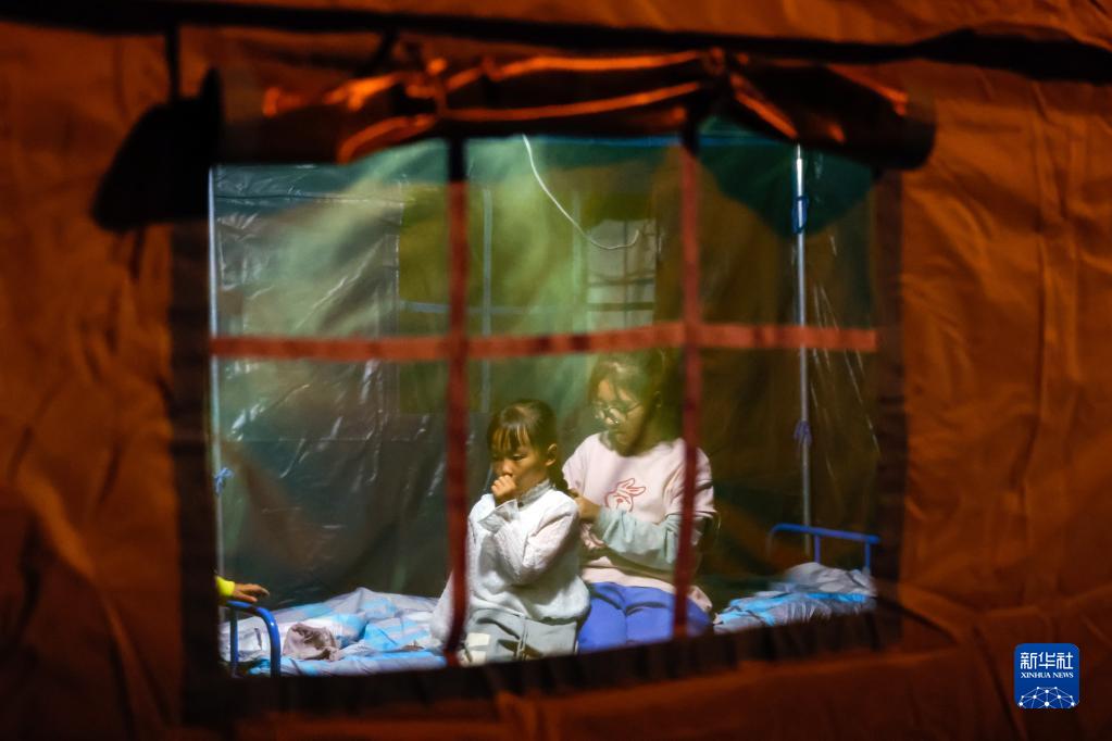9月5日晚,在四川甘孜州瀘定縣磨西鎮(zhèn)受災(zāi)群眾臨時(shí)安置點(diǎn),兩名小女孩在帳篷里。新華社 沈伯韓 攝