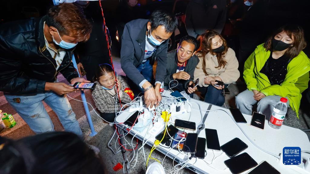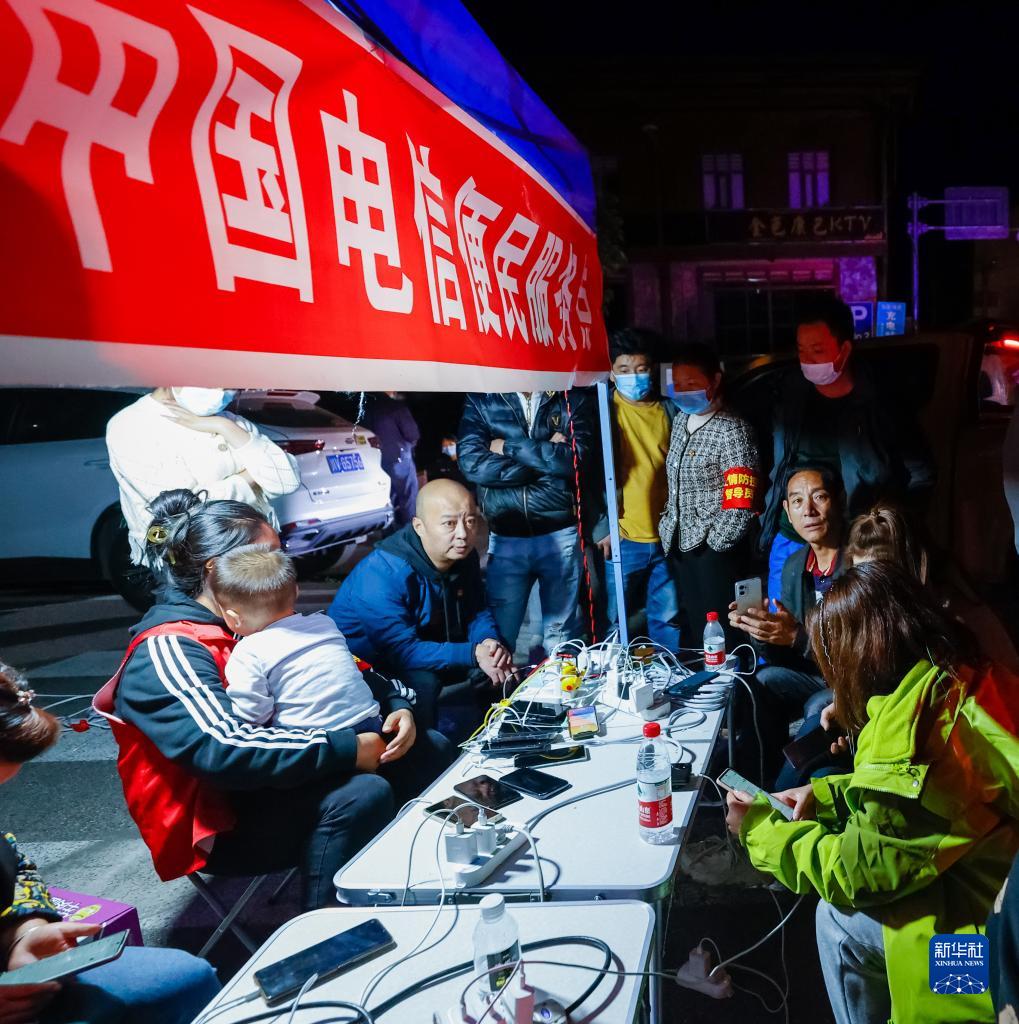 9月5日晚,在四川甘孜州瀘定縣磨西鎮(zhèn)的受災(zāi)群眾臨時(shí)安置點(diǎn),人們在中國電信便民服務(wù)點(diǎn)為手機(jī)充電。新華社 沈伯韓 攝